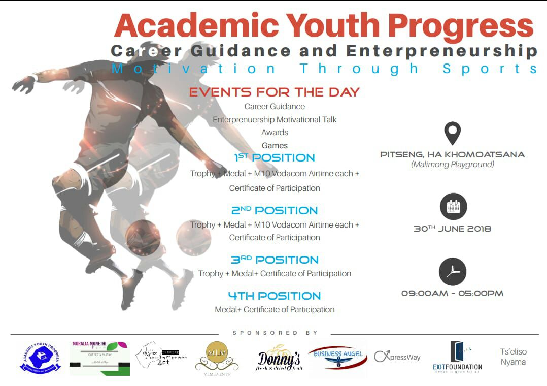 The Academic Youth Progress will hold a Career Guidance and Entrepreneurship Motivation seminar on the 30th June at Pitseng, Ha Khomoatsana from 09:00am to 05:00pm.