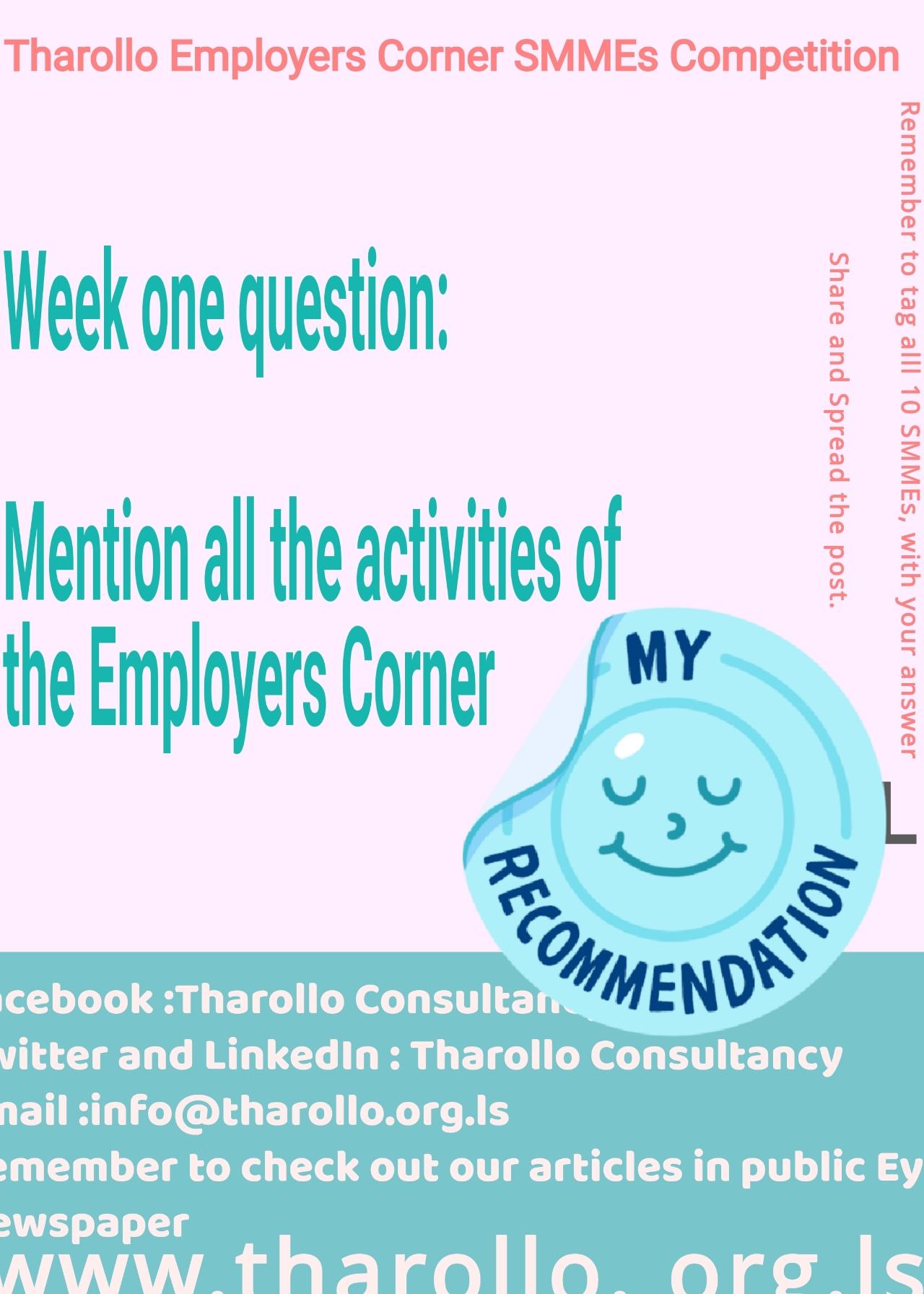 You are also expected to tag a minimum of 10 (Ten) SMMEs and their contact details on your answer, and if you are emailing it, kindly attach a list of those Ten SMMEs which could benefit from services of the Employers Corner. (Current SMME members are free to join too)’