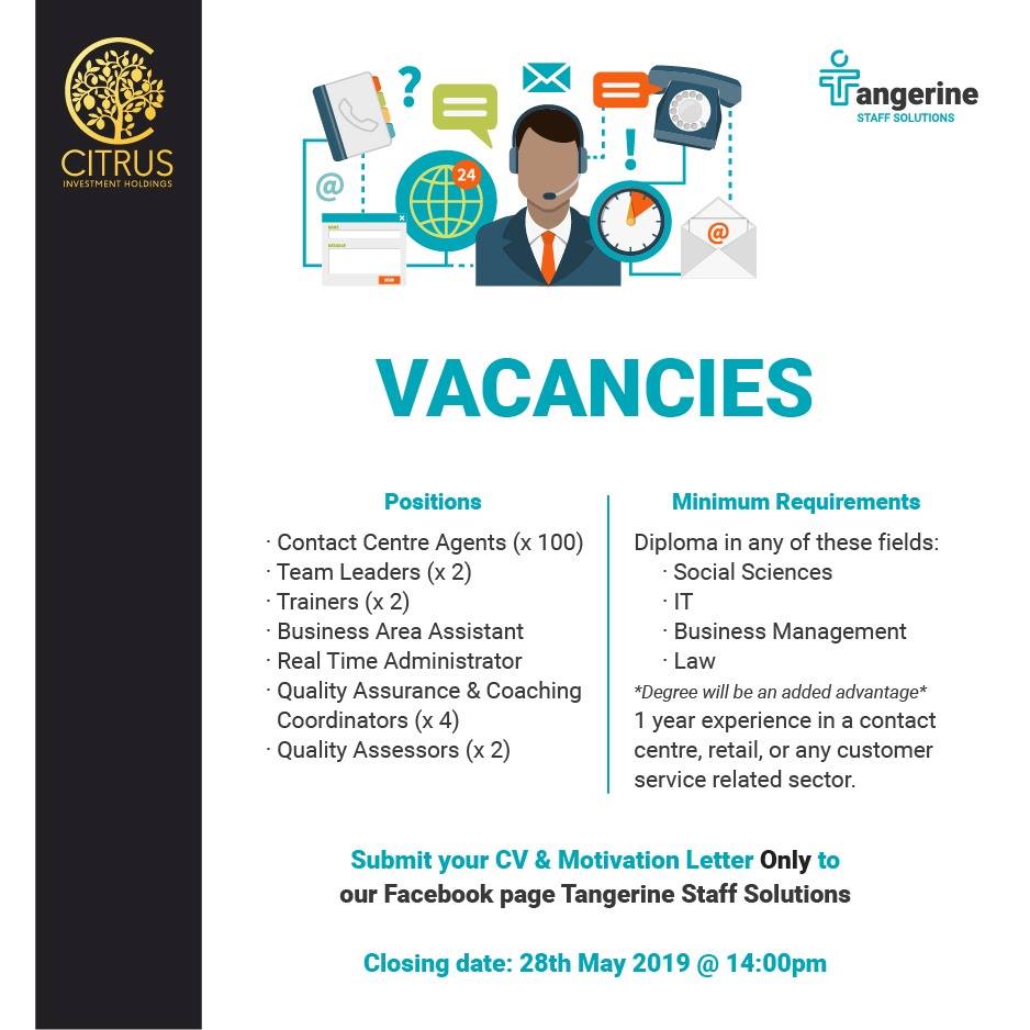 OpportunitiesLocal Jobs Various Vacancies at Tangerine By Selibeng.com - May 23, 2019 8650 FacebookTwitterWhatsAppLinkedinEmail Tangerine reserves the right to use additional/relevant information as criteria for shortlisting. All the best! Comments